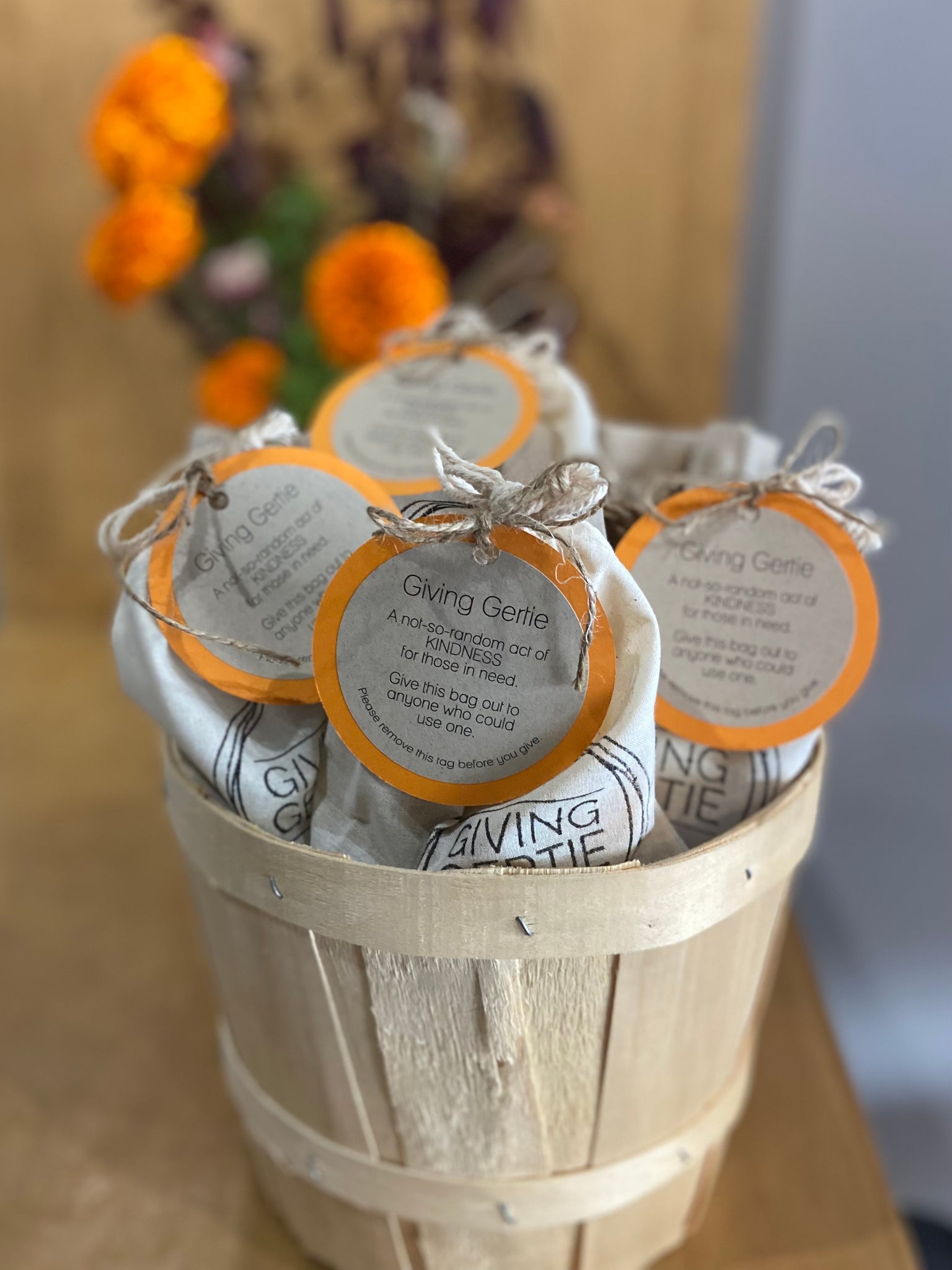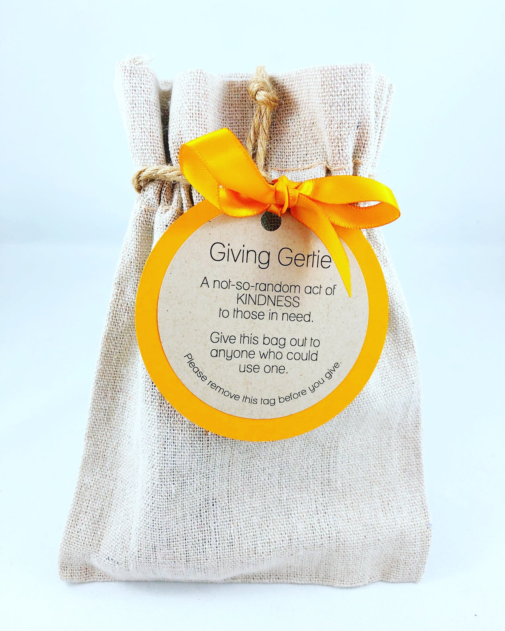 Give out the Giving Gerties: Receive the Giving Gertie bags that you purchase and give them to people in need in your community OR give them to friends and family as a gift that keeps on giving- so they can give the bags to people in need in their community. Contactless pick up is available.